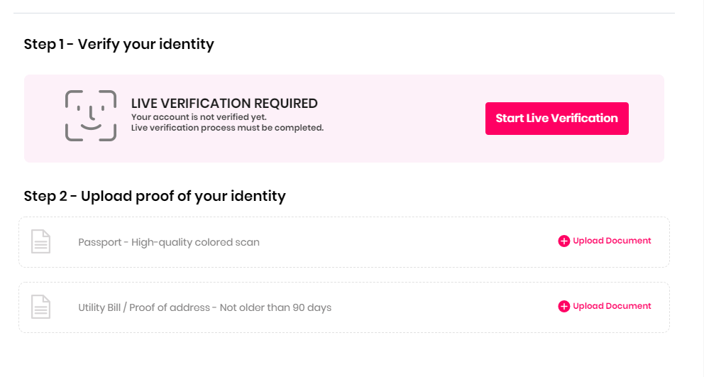 然后点击start live verification进行在线验证,需要电脑有摄像头,然后按照要求手持证件在摄像头前展示证件。