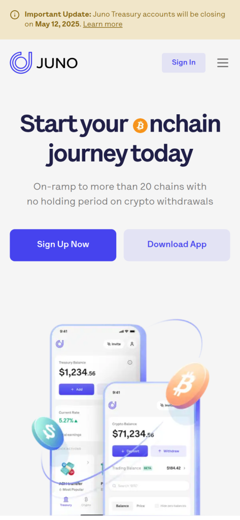 Juno 的核心价值主张体现在其官网描述中:“On-ramp to more than 20 chains with no holding period on crypto withdrawals”。这意味着:
