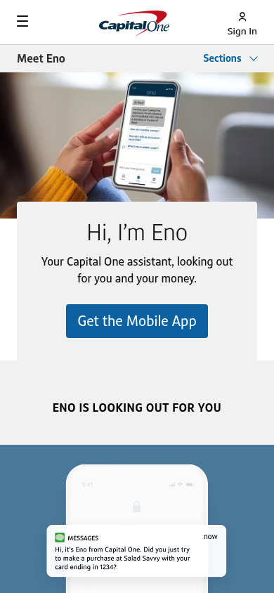 Eno 是 Capital One 独有的数字助手,集成于其在线银行与App中,为企业用户提供主动式财务管理支持。