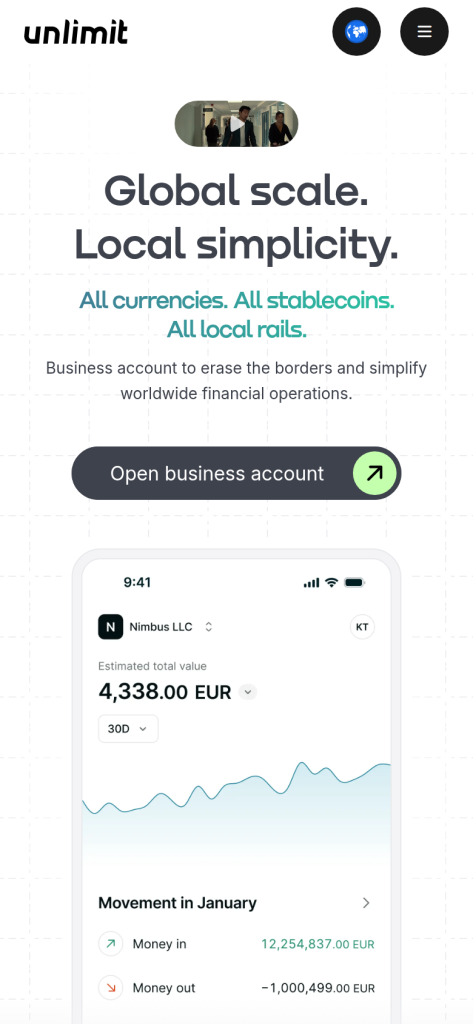 该平台由 Unlimit 集团支持,专注于为成长型企业提供现代化的金融基础设施。其服务不仅限于账户开立,更延伸至企业日常运营中的资金流转、成本控制与国际支付等关键环节。